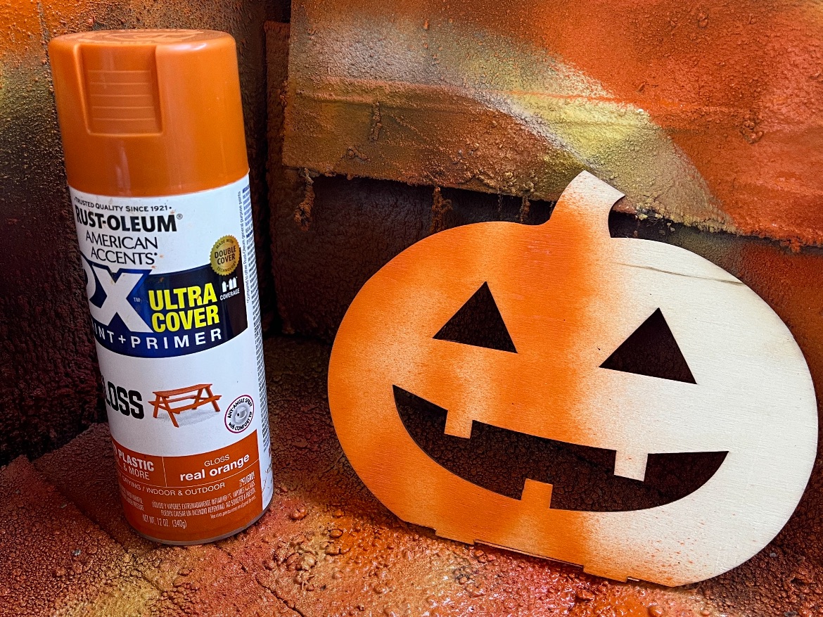 Now, you have to spray paint your wooden cutouts using the orange color make sure you use a couple of coats. For more detailing use a bit of brown to outline your pumpkin and some green for you stem. ⬇️⬇️