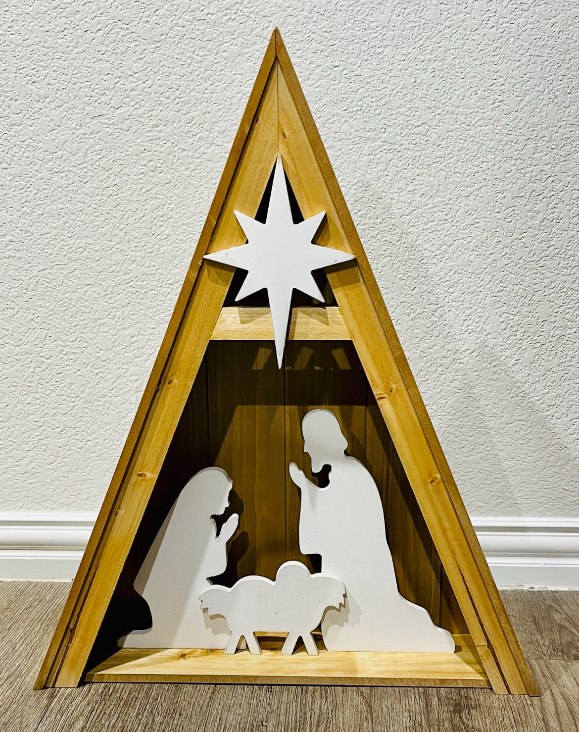 Hide the light strands in one of the corners inside the nativity piece.